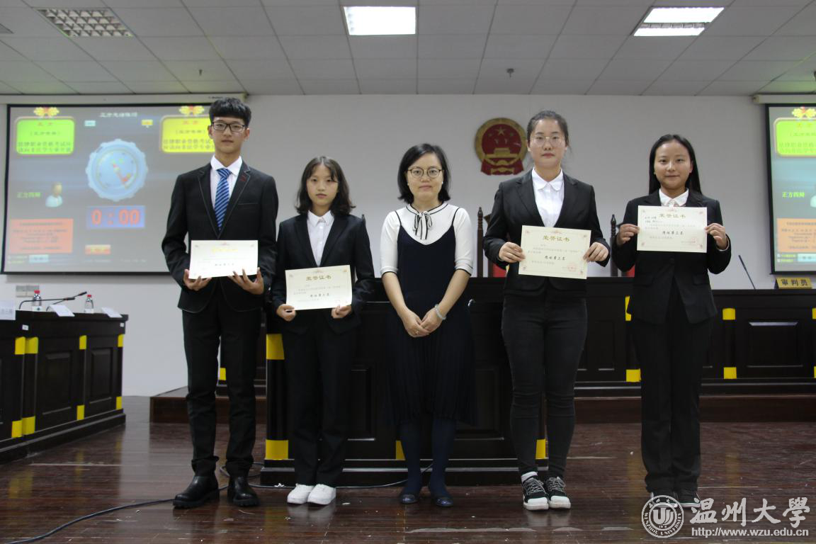 本次辩论赛分成两轮,共有四支队伍参赛。辩手们在紧张激烈的辩论之中,侃侃而谈,颇有舌战群儒之势。他们面对质疑毫不示弱,唇枪舌战之中体现了自己的辩论技巧和良好的心理素质,展现了法政学子的优良风貌。其中,第一场比赛的正方二辩马锐,无论在驳论还是自由辩论环节,她都条理清晰、语言流畅,能精确地把握发言时间,并且目光坚定地直视对方辩手,淡定自若地不像是一位大一新辩手,更像是有多次比赛经验的成熟辩手。在每场辩论会结束之时,现场提问的环节也颇为精彩,辩手们认真聆听了观众提出的问题并予以正面回答。邱杓丹老师对于辩论过程也进行了细致入微、独到精彩的点评,指出辩手们在辩论过程中存在的问题并为他们指点了辩论技巧。最终张启慧队和李宇臻队分别获得第一场和第二场辩论的胜利,李宇臻队更是获得了团体排名第一的好成绩。另外,蒋乐宁和马锐同学也获得最佳辩手的称号。邱杓丹老师为获奖的个人和团体颁奖并合影留念。