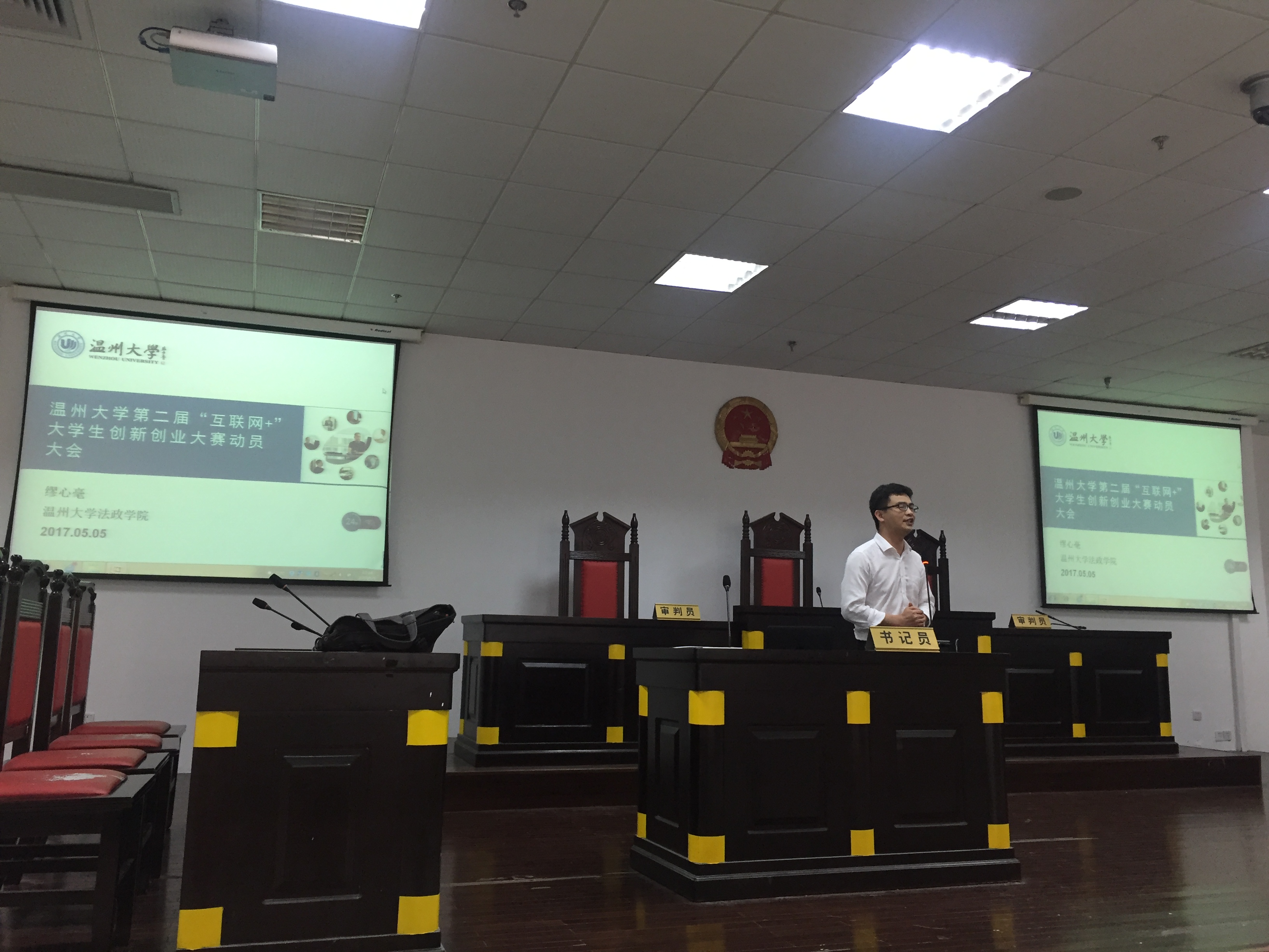 于5月5日下午在模拟法庭召开了"互联网+"创新创业大赛的动员大会。本次大会由缪心毫副院长主持,15、16级300多名同学参加了此次大会。