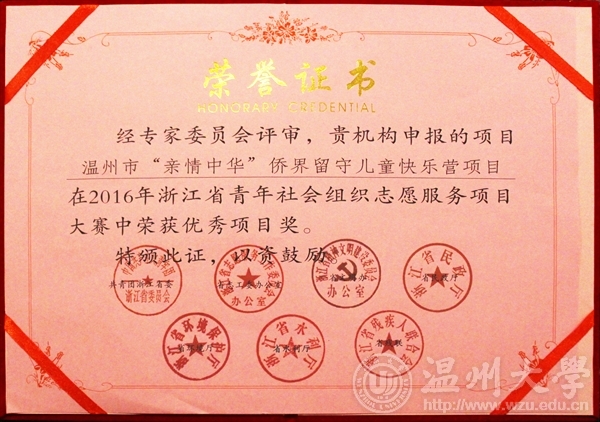 2016年9月8日,2016年浙江省青年社会组织志愿服务项目大赛在杭州举行,来自浙江省各地区、各高校的120个项目参赛,法政香蕉视频 学生社团的"关爱侨界留守儿童项目"荣获浙江省青年社会组织志愿服务优秀项目奖。