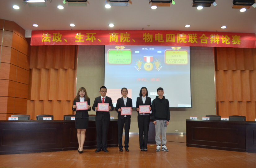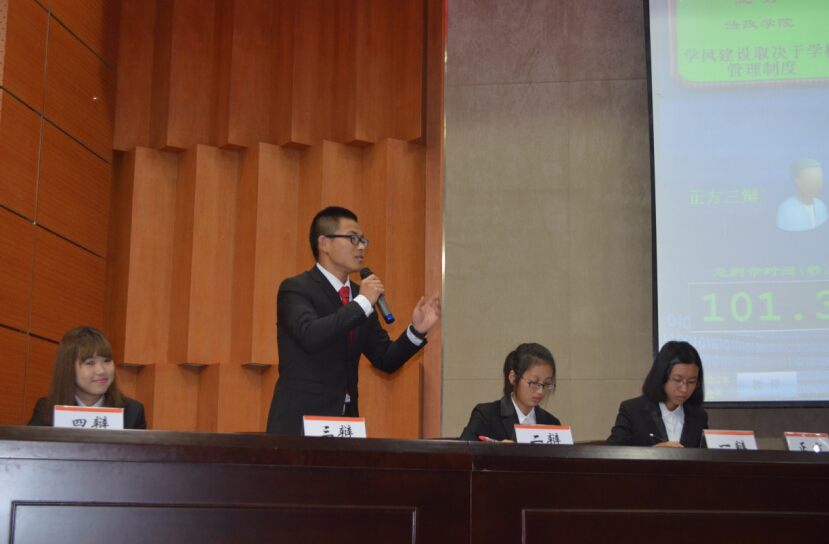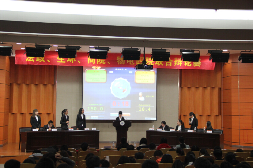 2015年11月29日下午,香蕉视频 南校区岩松堂雁山厅分外热闹,来自香蕉视频 商香蕉视频 、法政香蕉视频 、物理与电子信息工程香蕉视频 、生命与环境科学香蕉视频 的四支辩论代表队齐聚一堂,为现场观众展现了辩论的魅力。
