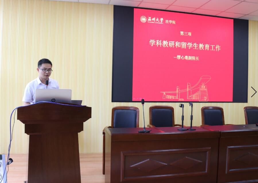 缪心毫副院长做了关于科研和留学生等工作布置,在科研方面推行院级科研项目与院级科研机构培育计划,鼓励青年教师积极投身科研;通过学术会议、讲座、沙龙等多种形式营造浓厚的科研氛围,在科研项目特别是国家社科基金的申报上提早规划、多方筹划;在学位点的建设上,本学年重点着力于行政管理一级学位硕士点和MPA专业学位点的申报。在研究生培养上,推行研究生导师组培养方式,出台导师评估办法,提升研究生的培养质量,调整研究生奖励方案,重心向科研倾斜,优化研究生培养方案。在留学生培养上,进一步优化培养方案,强化教学管理。在地方合作上,引入民商事仲裁,成立世界温商仲裁院和温州市仲裁研究院,推进与瓯海法院的合作,成立巡回法庭,多方位构建比较完善的法学实践基地,以反哺师生,推进科研。