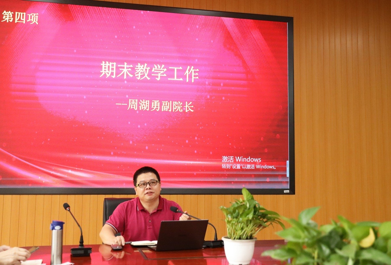 接着,周湖勇副院长对本学期的期末教学工作做出安排。周院长指出期末试卷出题要规范化,客观和主观题的占比要合理,题型应多样化,考题难易要适中。周院长还强调了教考分离和注意考试纪律。阅卷要规范化,平时成绩要有区分度。周院长还提到了下学期要启用智慧教室,老师们要做好相应的准备工作。