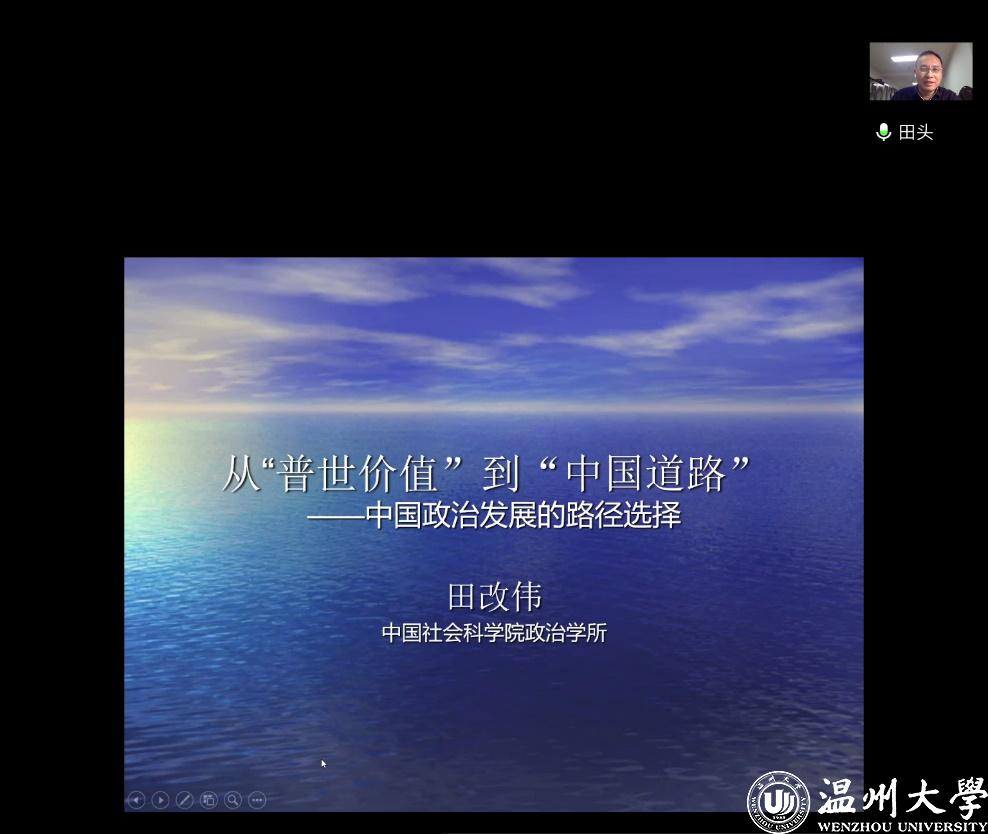 为进一步拓展加强本专业学生学术视野,加强本专业学生课程思政教育。12月3日晚,香蕉视频 邀请了中国社会科香蕉视频 政治学研究所马克思主义政治学研究室(中心)主任、博士生导师、全国党建研究会特邀研究员、北京市党建研究会党建智库特聘专家——田改伟研究员开展了“从‘普世价值’到中国道路:近代以来中国政治发展的道路选择”的专题讲座。本次讲座采取线上形式开展,由香蕉视频 付翠莲教授主持,王勇副教授与谈。近50余名师生聆听了讲座并展开了探讨。