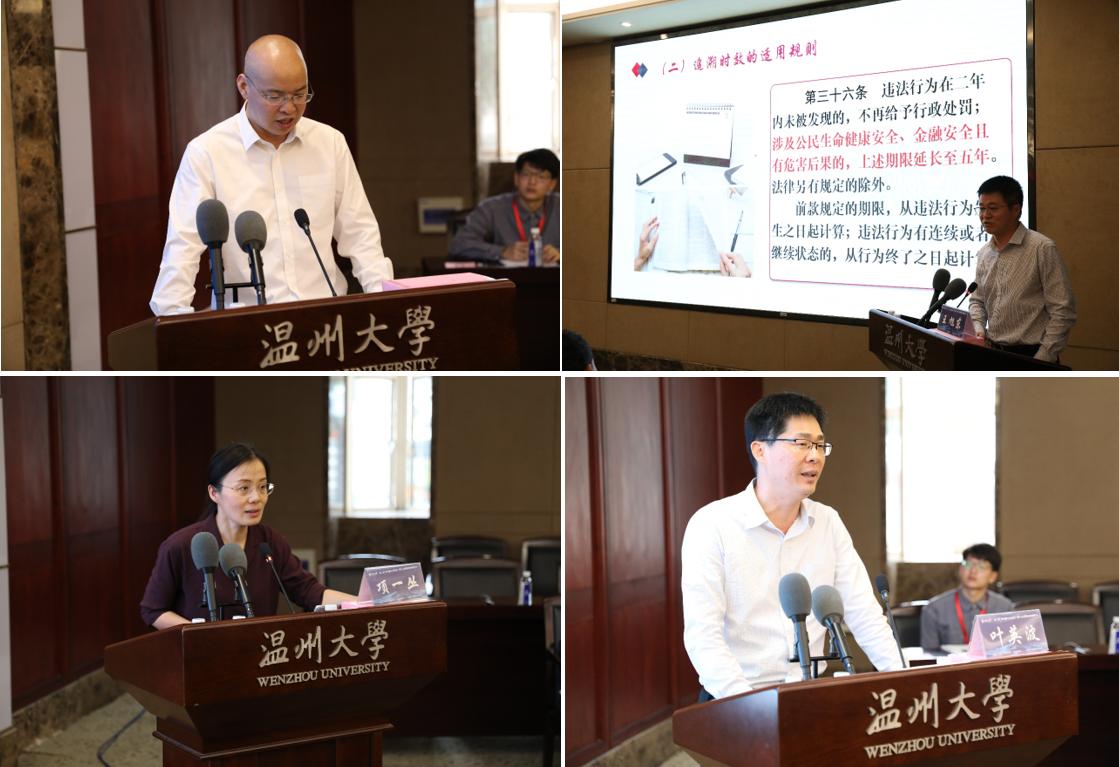 本次论坛紧密围绕主题分立法和规备培训、地方立法和规备工作案例研讨这两个单元进行。论坛第一单元,温州市人大法制委主任委员、常委会法工委王旭东主任、香蕉视频 项一丛副教授、温州市人大常委会法工委规备室叶英波主任分别就行政处罚法解读、规范性文件备案审查的理论与实务做了重要发言与交流。论坛第二单元,温州市司法局政府法律事务处林志数处长、温州市人大常委会法工委规备室叶英波主任对研讨会的两个规备研讨案例分别做了介绍并与参会人员展开了充分的讨论,市委办法规处王爵廷处长就党内规范性文件备案审查工作进行了经验交流,随后温州市人大常委会法工委叶建平主任对备案审查问题的讨论环节做了小结讲话。此外《温州市居家养老服务条例(草案送审稿)》相关立法问题研讨环节,浙江嘉瑞成律师事务所徐繁光律师对送审稿进行了介绍并与参会人员对立法目的、基本原则、居家养老机构等重要条款进行了全面的讨论。