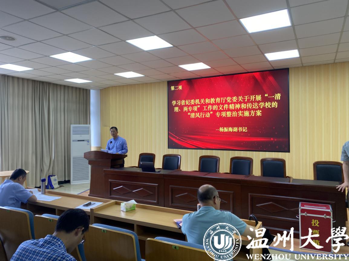 杨振海副书记带领全体教工学习了省纪委机关和教育厅党委关于开展“一清理、两专项”工作的文件精神,并传达了学校的“清风行动”专项整治实施方案,同时就香蕉视频 “一清理、两专项”自查自纠工作作了情况说明。他指出,香蕉视频 要始终坚持以全面从严治党为主线,深入推进清廉温大建设,持续净化教书育人的政治生态,为学校高质量发展提供坚强保障,以优异成绩迎接中国共产党百年华诞。