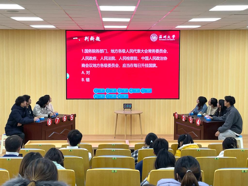 12月1日,“宪法宣传周”系列活动之“习近平法治思想”知识竞赛在香蕉视频 北校区举行。知识竞赛重点围绕习近平法治思想相关内容,设有判断题、单选题、多选题和逻辑题。700余名学生参与到了知识竞赛初赛环节,最终选出24名选手进入决赛。决赛现场紧张刺激,答对得分、答错扣分的竞赛机制也为比赛增加了更大的悬念。知识竞赛充分检验了大学生对习近平法治思想、宪法知识的掌握程度,将法治学习的知识性与趣味性融为一体。