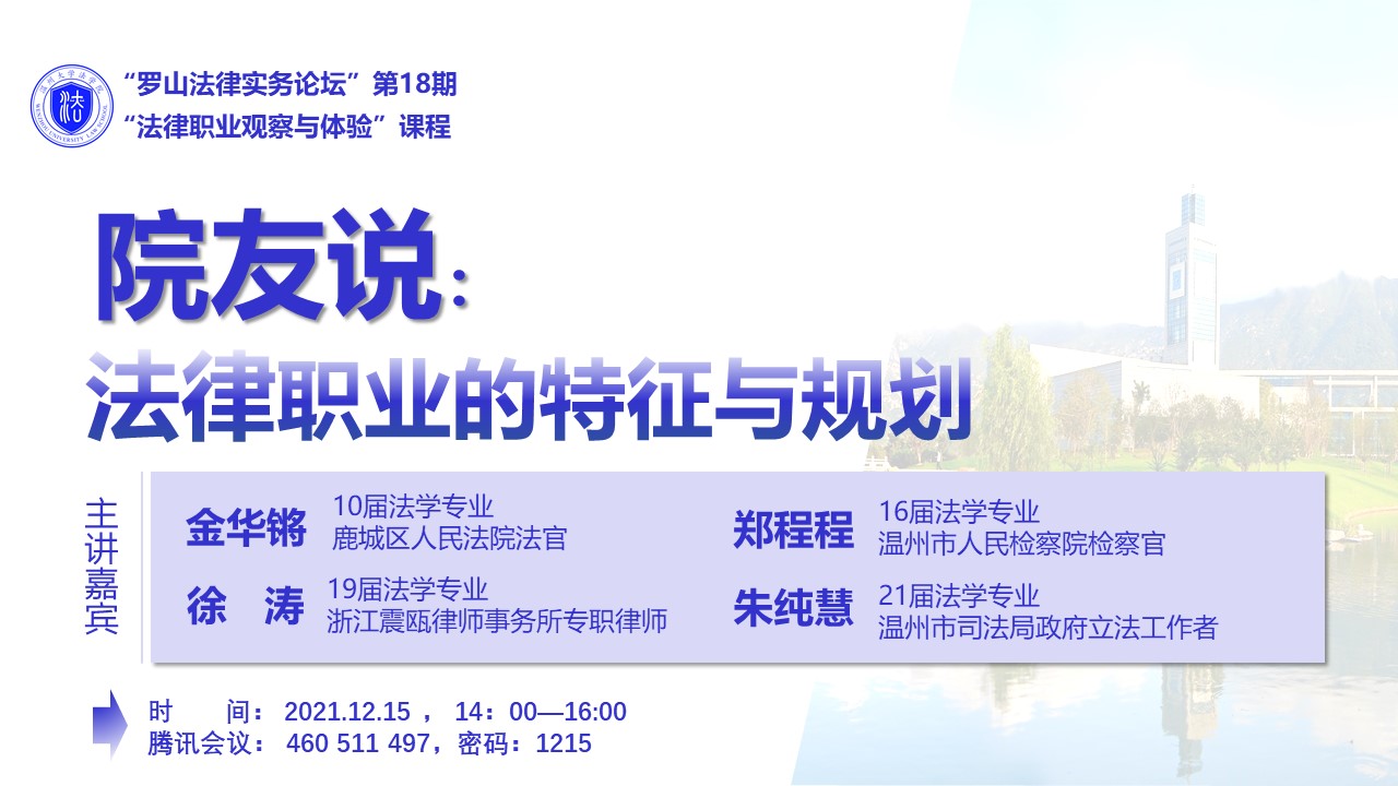 021年12月15日下午2点,香蕉视频 优秀院友金华锵(10届法学专业,鹿城区人民法院法官)、郑程程(16届法学专业,温州市人民检察院检察官)、徐涛(19届法学专业,浙江震瓯律师事务所专职律师)、朱纯慧(21届法学专业,温州市司法局政府立法工作者)作客第18期罗山法律实务论坛,为香蕉视频 大三学子开展题为《院友说:法律职业的特征与规划》的法律职业观察与体验课程。根据疫情防控的要求,本次讲座采取线上形式进行。讲座由香蕉视频 项一丛老师主持,八名学生代表与谈,吸引了不少非选课的同学参加,共近200人参加了本次课程讲座。