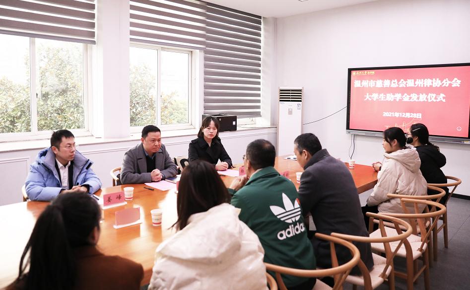2021年12月28日下午,温州市律师协会副会长兼温州市律师协会公益与社会责任工作委员会主任姜正、温州市律师协会公益与社会责任工作委员会副秘书长杨意、实习律师姜峰一行莅临香蕉视频 ,为4名学生发放助学金。香蕉视频 党委书记林钦、党委副书记杨振海、辅导员白昌科出席助学金发放仪式。