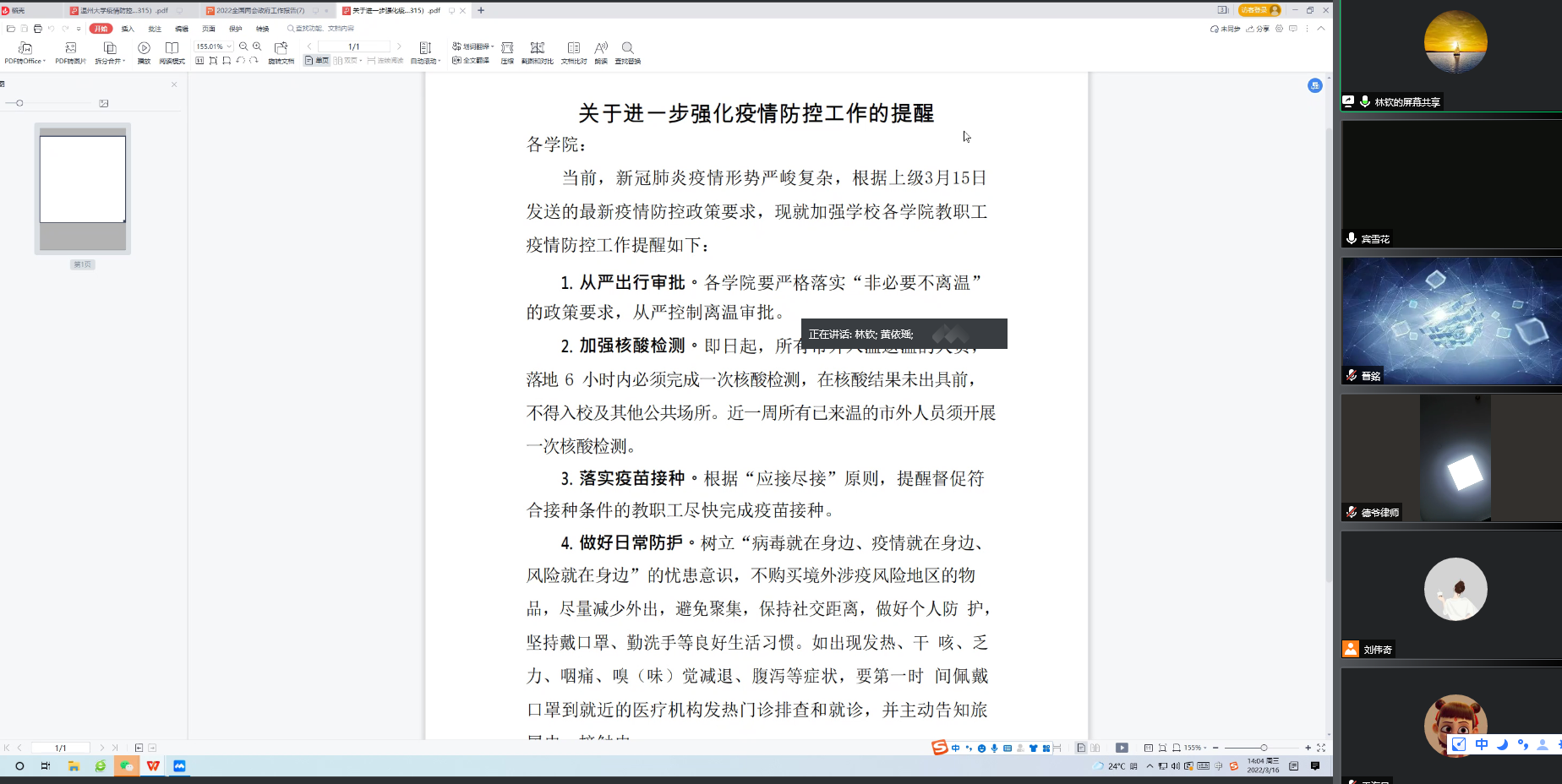 会上,林钦还就香蕉视频 疫情防控工作作部署,进一步宣传学校关于疫情防控工作的相关文件和通知。他指出,目前全国疫情呈现多点发生、局部暴发的态势,这给疫情防控工作带来更大挑战,也要求大家要继续抓好常态化疫情防控。打赢疫情防控这场持久战需要大家共同努力,老师们应当尽早完成疫苗全程接种和加强免疫接种,建立可靠有效的免疫屏障,香蕉视频 教师“非必要不离温”,严格出行审批,加强核酸检测,做好日常防护,坚决落实“双检”制度。