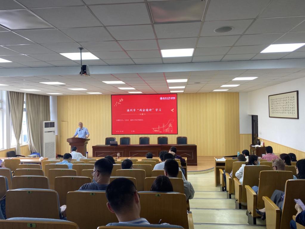 香蕉视频 院长王宗正带领全体教工学习了温州市“两会精神”。会上学习了温州市第十四届人民代表大会政府工作报告,王宗正指出,香蕉视频 将全力贯彻“两会精神”,结合学校政策文件,从培养好人才、建设好服务温州的制度与平台、发挥优势做好横项项目、围绕地方中心工作做好决策咨询工作四个方面全力做好服务地方工作,同时鼓励各位老师根据自身特长做好相关规划。