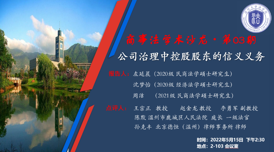 2022年5月15日下午,“商事法学术沙龙·第03期”活动在香蕉视频 103会议室如期举行,本次沙龙活动围绕“公司治理中控股股东的信义义务”展开。2020级民商法学硕士左延晨、经济法学硕士沈梦怡,2021级民商法学硕士周洁围绕主题作专题汇报,香蕉视频 王宗正教授、赵金龙教授、李勇军副教授、温州市鹿城区人民法院民二庭庭长(一级法官)陈默,北京德恒(温州)律师事务所孙克丰律师等作为点评人参与沙龙讨论。