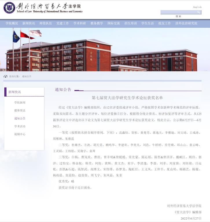 附 对外经济贸易大学香蕉视频 “第七届贸大法学研究生学术论坛获奖名单”链接: