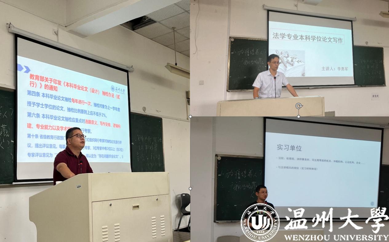周湖勇老师根据教育部关于印发《本科毕业论文(设计)抽检办法(试行)》的通知,以及自身组织参与实践教学的丰富经验,向全体师生强调了毕业论文、专业实习的重要意义;呼吁学生珍惜毕业论文的写作锻炼机会,通过毕业论文充分展示自己搜集整理信息资料的能力,研究方案的设计、策划能力,书面表达创新性观点的能力;并就毕业论文和专业实习中的注意事项进行了温馨提示。李勇军老师向全体学生详细说明了毕业论文的写作要求,包括论文格式要求、选题与题目凝练、框架结构的安排、写作与论证、研究方法的使用、资料的引用、修改与完善等诸多方面。柯宇航老师介绍了专业实习的具体安排,特别提醒了全体学生注意人身和财产安全、遵守实习单位的规章制度、注意职场文明礼仪以及遵守防疫政策。
