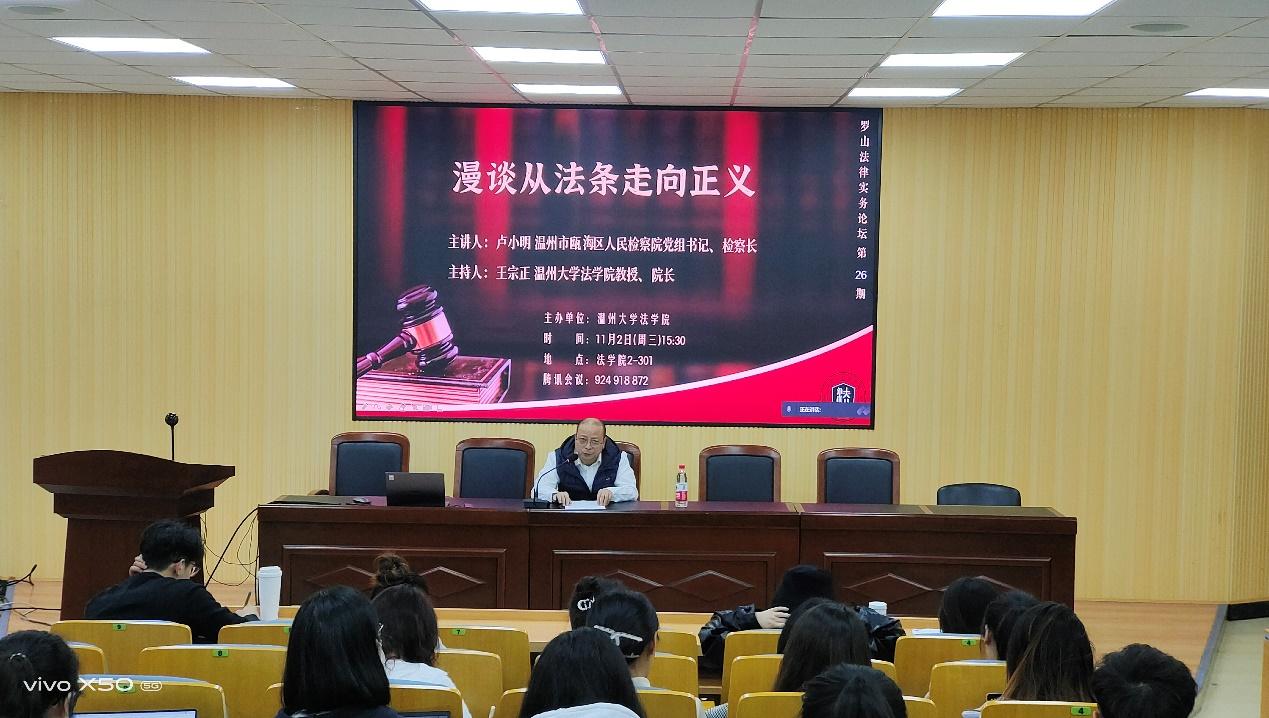 2022年11月2日下午,温州市瓯海区人民检察院党组书记卢小明检察长应邀作客“罗山法律实务论坛”,为香蕉视频 师生带来题为《漫谈从法律走向正义》的讲座。本次讲座采取线上线下结合的方式,在香蕉视频 301会议室和腾讯会议直播间举行。讲座由香蕉视频 院长王宗正教授主持,共300余人参加了此次讲座。