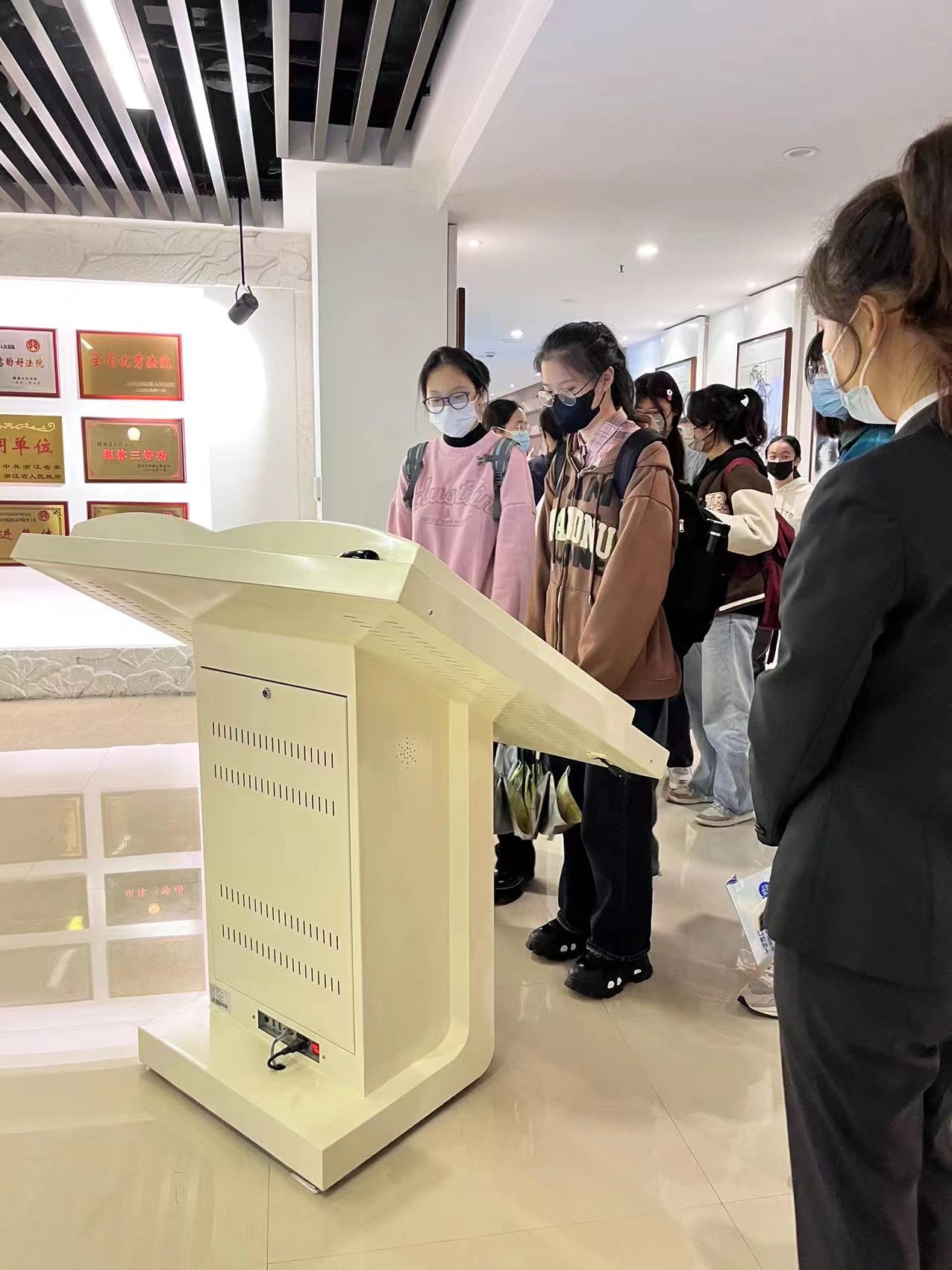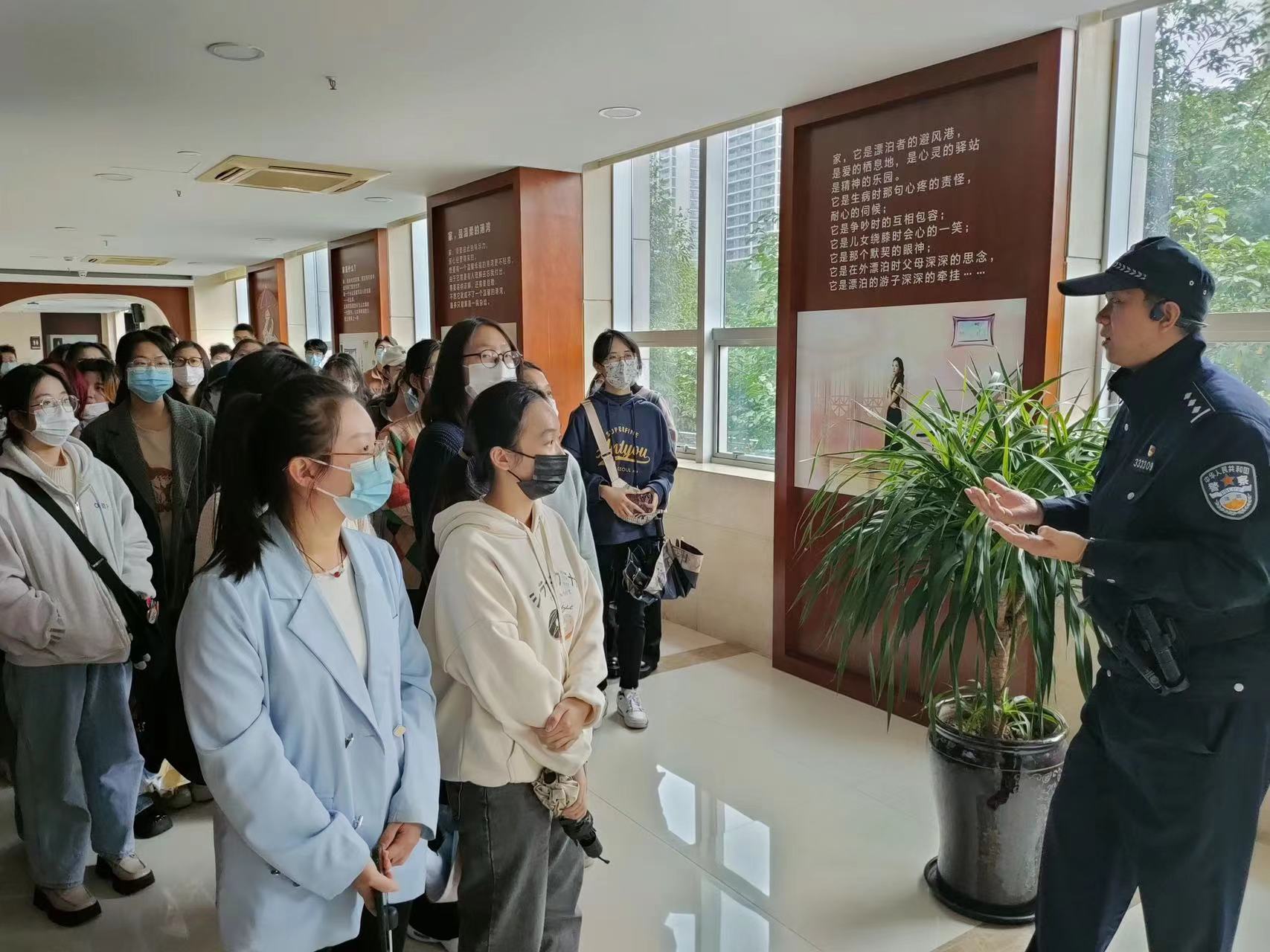 在参观法庭部分,瓯海法院的项力博警官带领大家参观了瓯海区人民法院比较有特色的家事法庭、心理调解室、调解区、展览廊和阅读厅等。其中,调解区甚至特别安排了供以小朋友玩耍的滑滑梯,阅读厅也有小型唱歌亭用以工作人员午休时间放松,方方面面都体现出了温暖的人文关怀。项警官自己本身也是志愿服务队的一员,其讲解过程也结合了很多的志愿服务经历和温州的历史文化,给大家的启发也很大。
