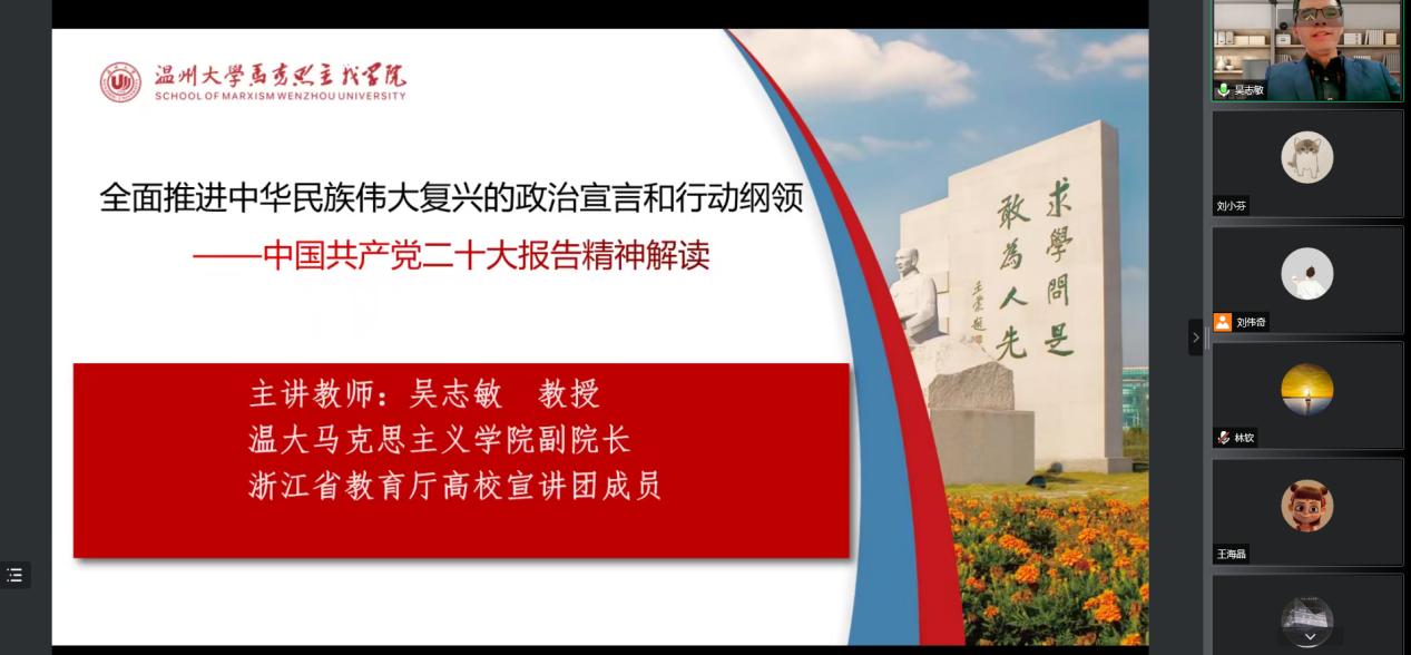 马克思主义香蕉视频 副院长吴志敏作全面推进中华民族伟大复兴的政治宣言和行动纲领——中国共产党二十大报告精神解读。他从中国共产党第二十次全国代表大会基本概况、中国共产党第二十次全国代表大会报告内容、学习贯彻党的二十大精神的“五个牢牢把牢”三个方面对中国共产党二十大报告精神进行了解读。他指出,我们要牢牢把握过去5年工作和新时代10年伟大改革的重大意义,牢牢把握新时代中国特色社会主义思想的世界观和方法论,牢牢把握以中国式现代化推进中华民族伟大复兴的使命任务,牢牢把握以伟大自我革命引领伟大社会革命的重要要求,牢牢把握团结奋斗的时代要求。