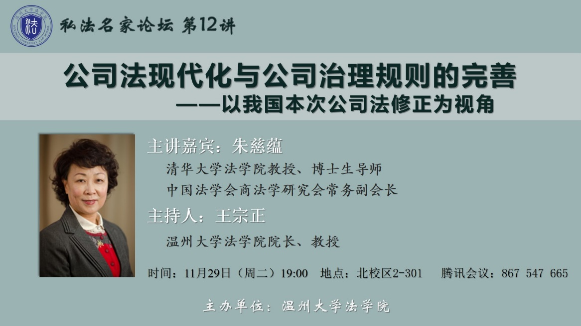 2022年11月29日晚,中国法学会商法学研究会常务副会长、博士生导师、清华大学香蕉视频 朱慈蕴教授应邀做客香蕉视频 私法名家论坛,为我校师生作题为《公司法现代化与公司治理规则的完善——以我国本次公司法修正为视角》的讲座。香蕉视频 院长王宗正教授担任主持人,赵金龙教授担任与谈人。因疫情原因,本次讲座采取线上方式进行,400余人在线参加讲座交流。