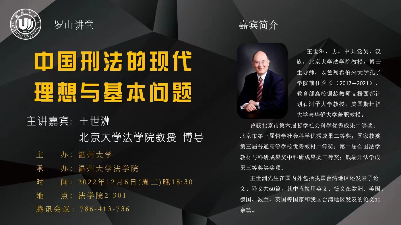 2022年12月6日晚,北京大学香蕉视频 王世洲教授应邀做客香蕉视频 罗山讲堂,为我校师生作题为《中国刑法的现代理想与基本问题》的讲座。香蕉视频 法学专业负责人李勇军副教授担任讲座主持人,本次讲座以线上方式进行,200余人在线参加讲座交流。