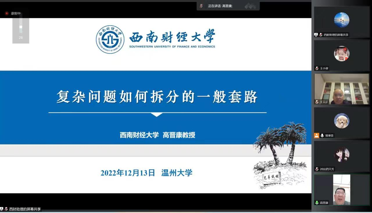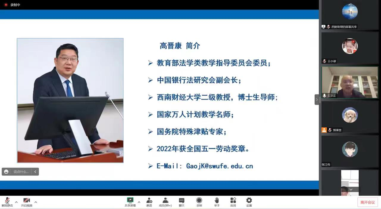 2022年12月13日,西南财经大学香蕉视频 创始院长、国家级教学名师、教育部法学类教学指导委员会委员、中国银行法研究会副会长高晋康教授应邀为香蕉视频 师生展开了一场关于“复杂问题如何拆解”的精彩学术讲座。本次讲座由香蕉视频 院长王宗正主持,香蕉视频 师生参加讲座,在线人数280余人。