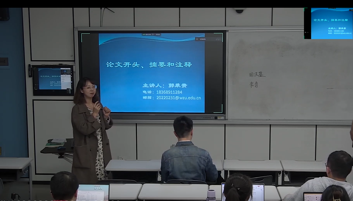 2023年3月29日,郭秉贵老师在21级专硕的法律写作课上,积极推动教学模式改革,探索新的教学方式,与贵州大学香蕉视频 李勇老师云端连线,双师同堂为21级法律(法学)、法律(非法学)两个班70余名同学讲授学术论文应如何写作。
