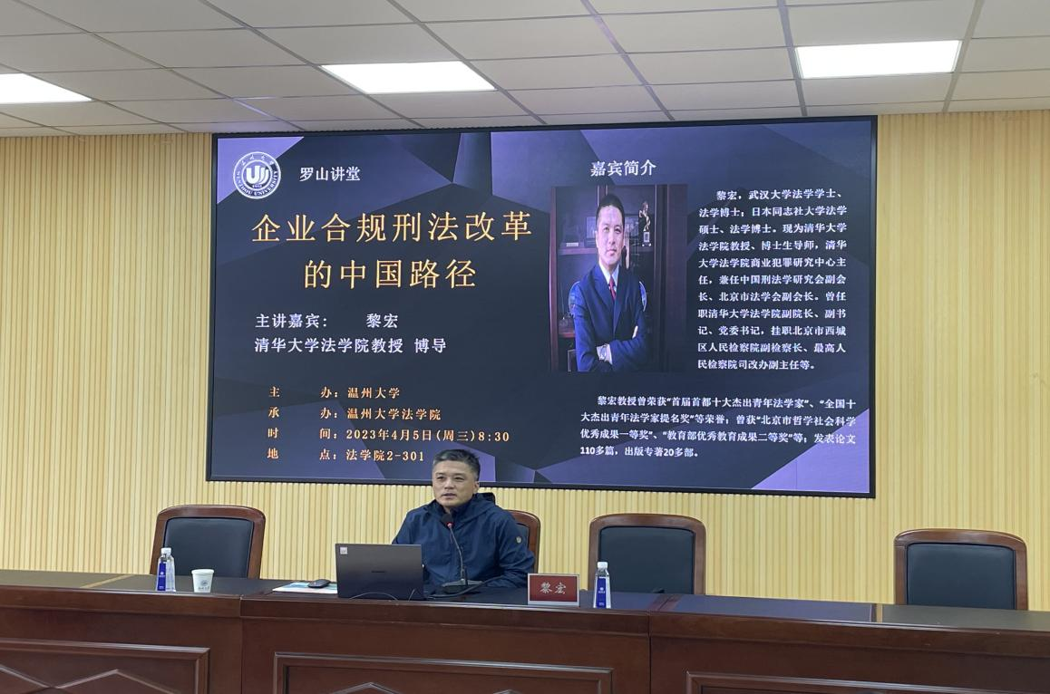 2023年4月5日早8点半,清华大学香蕉视频 教授、博士生导师黎宏应邀作客“罗山讲堂”,为香蕉视频 师生带来题为《企业合规刑法改革的中国路径》的讲座。本次讲座在北校区香蕉视频 2-301教室,香蕉视频 法律系主任谢丽珍老师、吴之欧老师及香蕉视频 近百本科生、研究生参加了此次讲座。