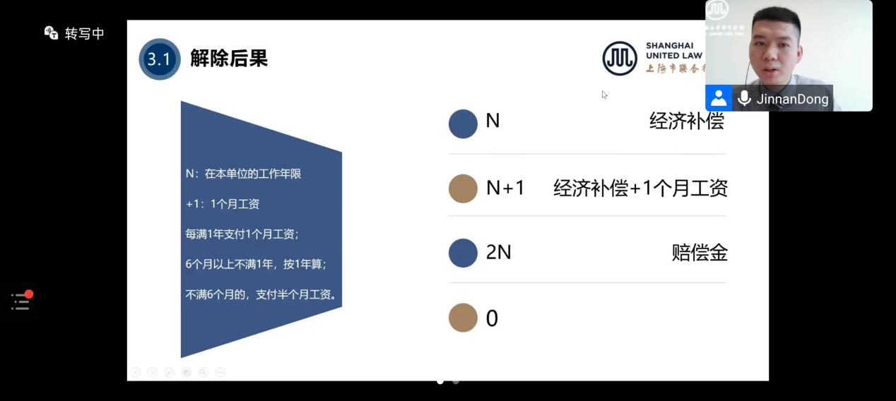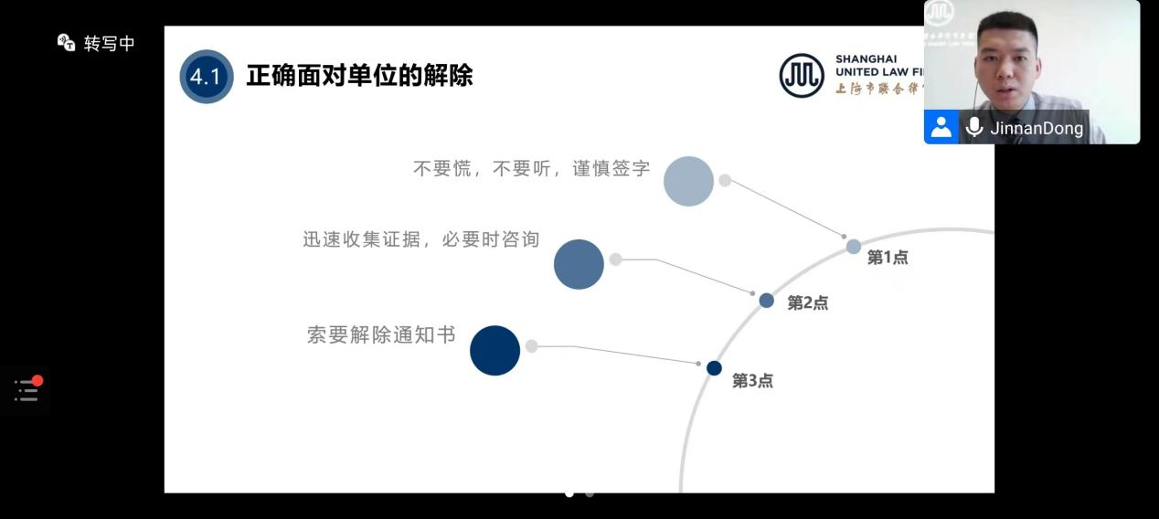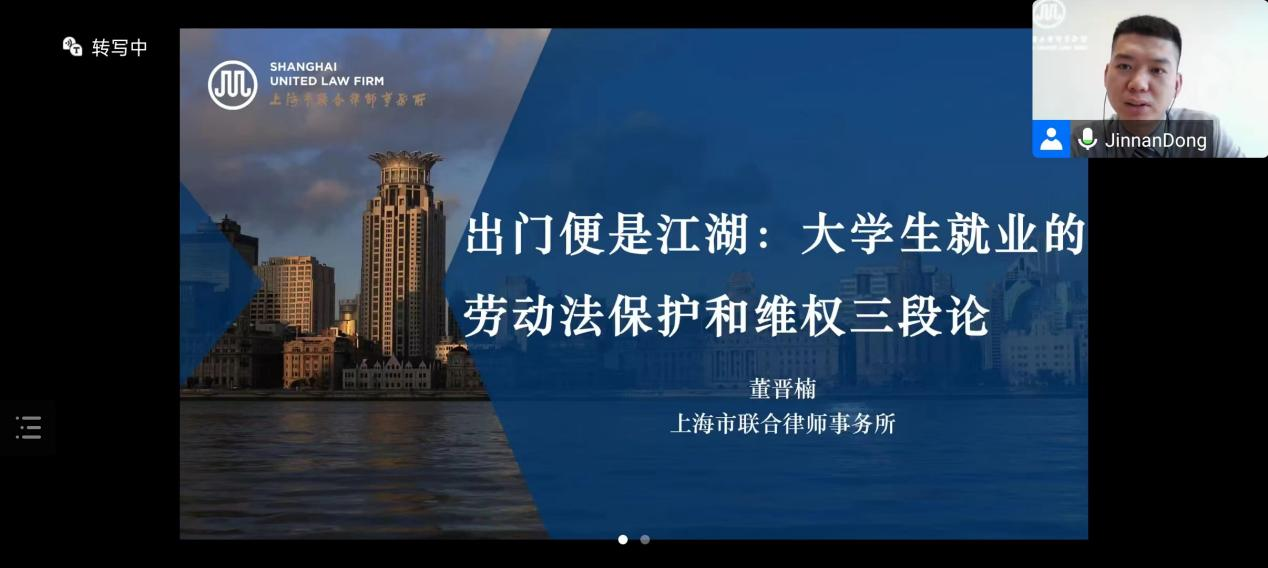 2023年4月9日上午,上海联合律师事务所的董晋楠律师应邀为香蕉视频 《劳动法治教育》课程的学生作题为《大学生就业的劳动法保护和维权三段论》的讲座。本次讲座以线上方式进行,香蕉视频 老师白亚宁及全校各专业学生近400人在线参加讲座交流。