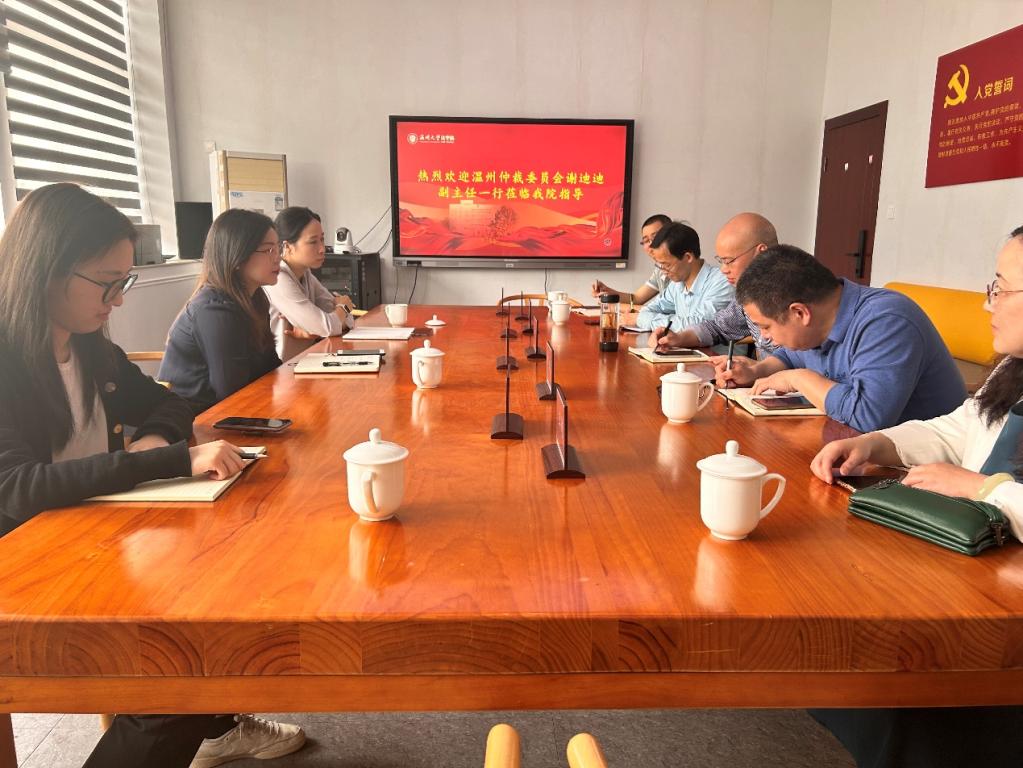 4月18日下午,温州仲裁院副院长谢迪迪、工作人员张辛、孙梦迪等到香蕉视频 考察交流,院长王宗正教授,副院长周湖勇教授,法学专业负责人、民商经济法系主任李勇军副教授,副主任柯宇航老师,国际法系李娟副教授参加座谈交流。