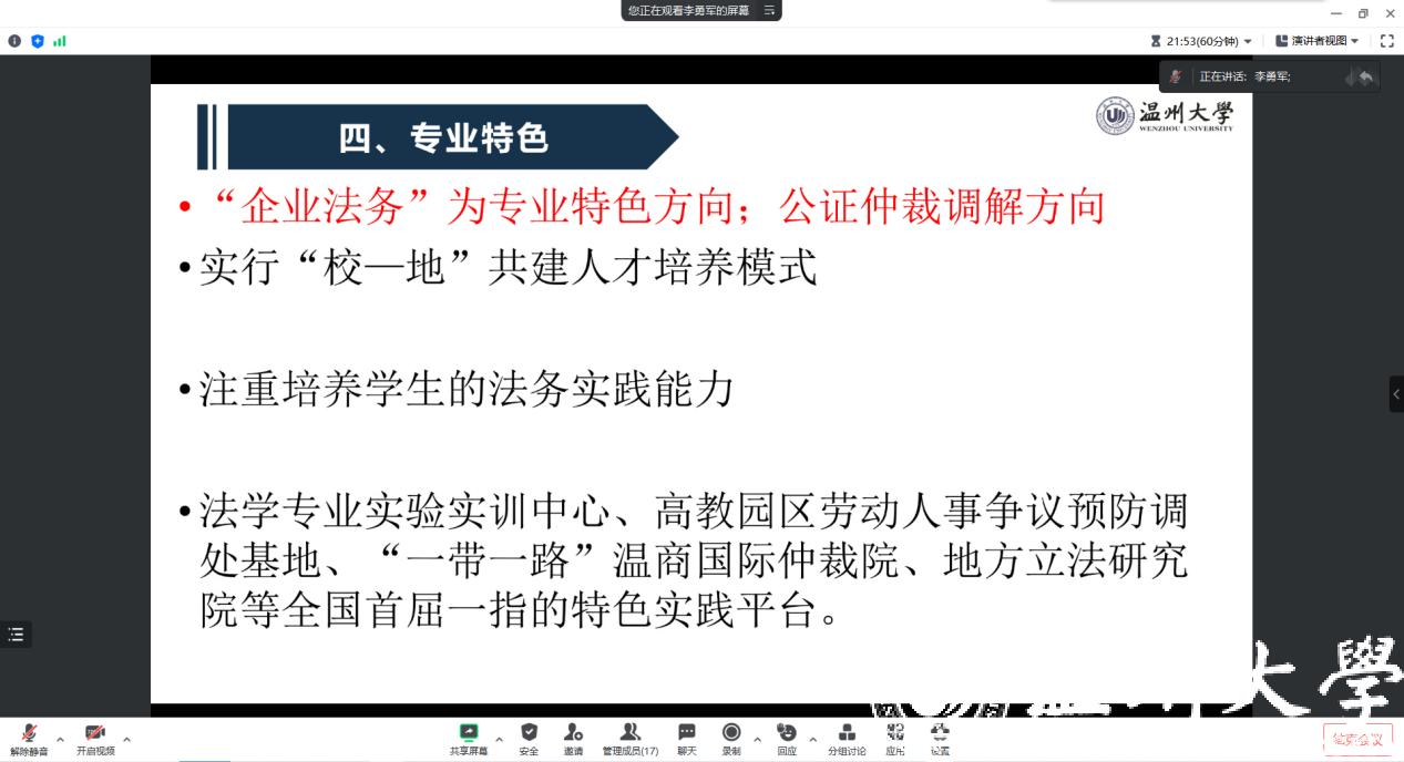 法学专业负责人李勇军老师从香蕉视频 法学专业的排名、师资力量等方面介绍法学专业的概况,然后介绍了法学专业的培养目标、专业主干课程、专业特色以及就业和升学前景,着重讲述了香蕉视频 的法学专业以“企业法务”为专业特色方向,国际化特色明显,学风优良,人才培养质量不断提升,法考通过率在全国名列前茅等,最后鼓励同学们努力学习专业知识,并热烈欢迎同学们和他交流。