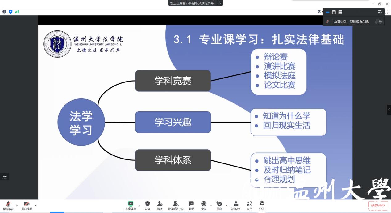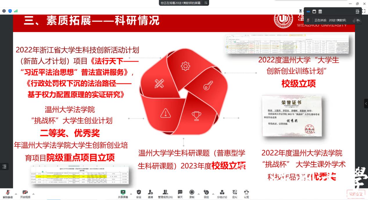 来自法学专业的黄歆妍同学,她从专业学习、学生工作、素质拓展三方面分享了进入大学以来三年的法学学习、生活和工作,展示了自己的学习方法、工作收获和成就,最后表示随时欢迎同学们前来提问。