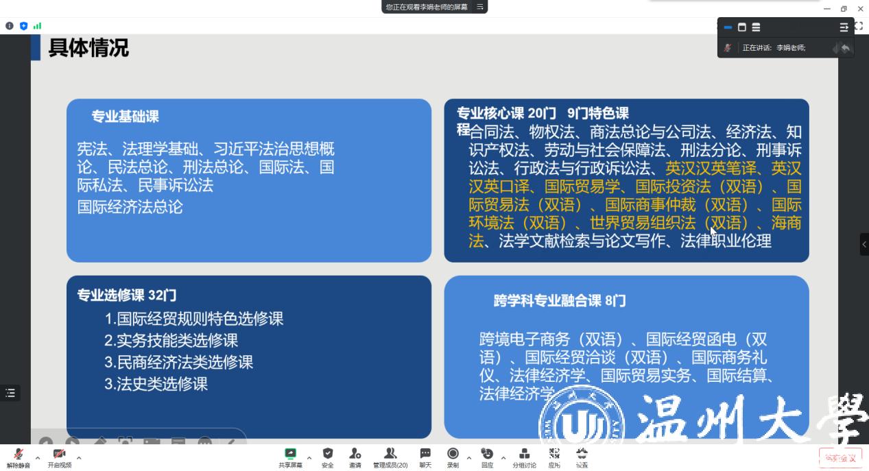 国际经贸规则专业负责人李娟老师介绍了国际经贸规则专业为法学类特设专业、新设专业,需求多、缺口大,着力培养既具备扎实的国内法学理论知识和执业能力,又精通国际经贸规则的经贸法律人才,接着介绍了专业特色目标、课程设置、就业前景和考研情况,特别提到了该专业学习中的特色是参加FDI国际投资仲裁竞赛等高规格国家竞赛,并鼓励同学们勇敢尝试、多多参与。