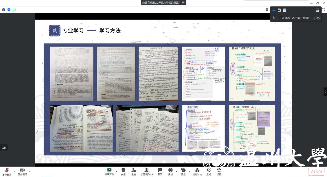 来自行政管理专业的庄梦雪同学做主题为“借实干整饬自我,以笃行丰盈青春”的报告,她从个人简介、专业学习、专业活动和自身经历等方面展开了分享,她提到“好记性不如烂笔头”,鼓励同学们找到适合自己的方式记笔记,可以借助思维导图等更好地帮助自己记忆知识点。