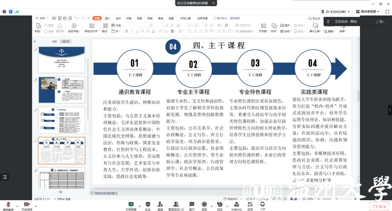 行政管理专业负责人吴素雄老师介绍了行政管理专业的概况,重点讲述了行政管理专业就业面非常广泛,涉及政治学、社会学、法学等多个领域,列举了行政管理专业未来的就业方向,最后希望同学们不要对这门专业抱有迷茫的态度,鼓励同学们多实践,朝着复合型、应用型和创新型的管理类人才靠近。