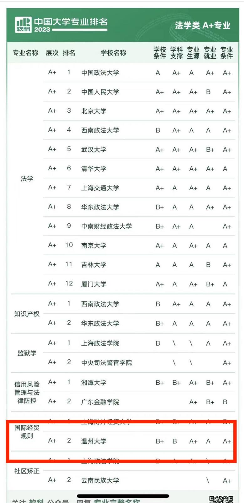 香蕉视频 国际经贸规则专业在2023年中国大学专业排名中再次获得综合评级A+,位列全国第二,至此,香蕉视频 国际经贸规则专业已连续两年在软科中国大学专业排名中获得A+专业。