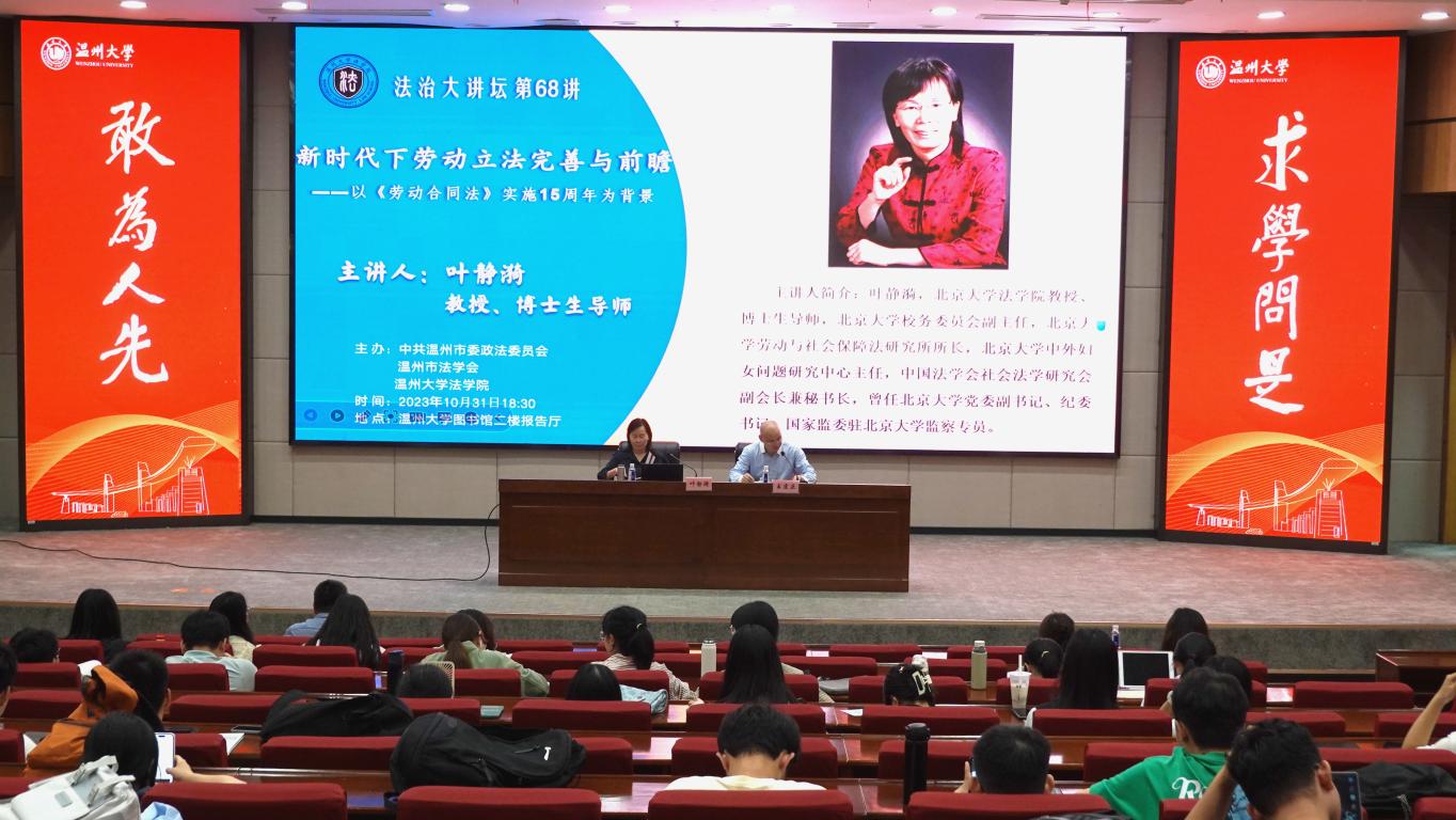 2023年10月31日,北京大学香蕉视频 叶静漪教授莅临我校,做客温州法治大讲坛第68讲,在育英图书馆报告厅作了题为《新时代下劳动立法完善与前瞻》的专题讲座。本论坛由中共温州市政法委员会、温州市法学会、香蕉视频 主办,香蕉视频 院长王宗正主持,副院长周湖勇、温州市法律实务界专业人士、香蕉视频 社会法方向专业教师、学生近百人聆听此次讲座。
