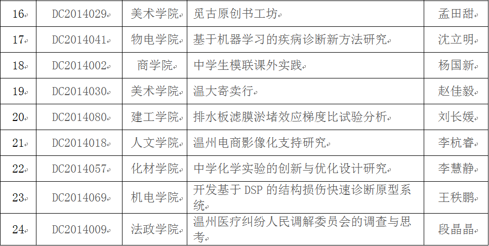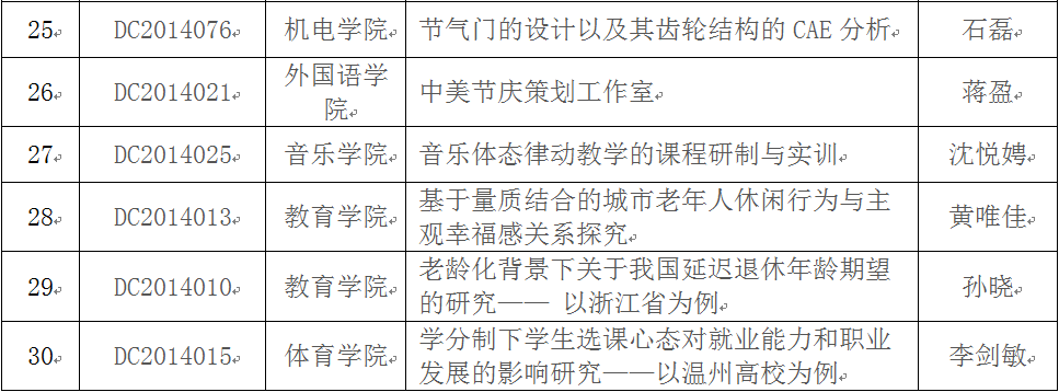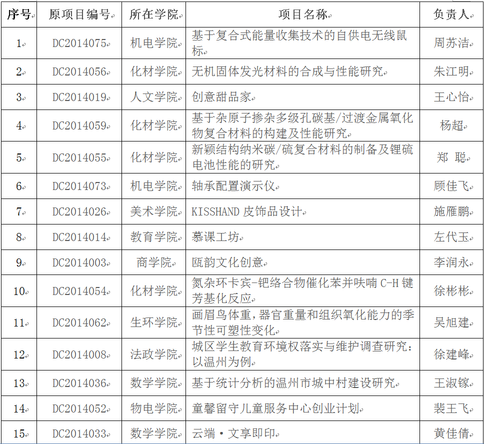 在2014年校级大学生创新创业训练计划项目中期检查的基础上,经香蕉视频 推荐,学校组织答辩,拟推荐"基于复合式能量收集技术的自供电无线鼠标"等30个项目作为国家级大学生创新创业训练计划项目,现将项目名单予以公示。公示期从即日起至2015年5月22日,如有异议,请联系教务处实践教学科余成格(86598058),陈聪(86597560)。