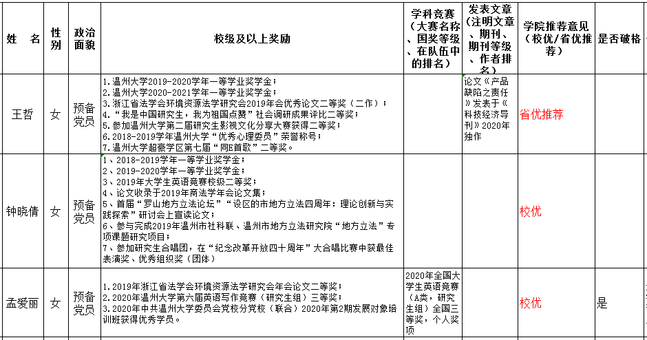 根据《香蕉视频 研究生优秀毕业生评选办法》(行政〔2019〕225号)(附件1)文件精神,香蕉视频 组织开展了2021届研究生省、校级优秀毕业生的预评工作。香蕉视频 名额:省优1人、校优1人。通知发出后,有5名学生报名参评。其中孟爱丽同学获得全国大学生英语竞赛三等奖,破格推荐评为校级优秀毕业生,不占用香蕉视频 名额。香蕉视频 审核申报者的材料,由学生工作委员会根据学生的学习成绩、获奖、科研成果、平时综合表现等情况投票,决定推荐王哲参加省优毕业生评选、推荐钟晓倩评为校优毕业生。具体由学校研究生工作部复审后公示最终的评选结果。现将学生的基本信息公示如下:
