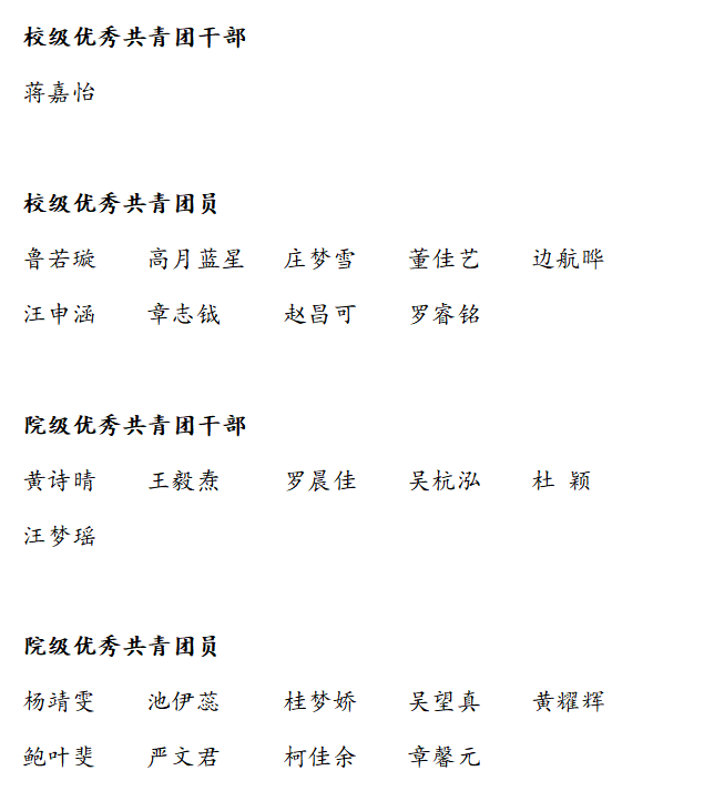 根据《团发〔2023〕7号:关于评选2022年度校“优秀共青团干部”、“优秀共青团员”的通知》,经学生本人申请、班级推荐、香蕉视频 团委审核,通过民主投票选举产生,拟推选以下同学参评2022年度“校级优秀共青团干部”、“校级优秀共青团员”及“院级优秀共青团干部”、“院级优秀共青团员”,现将名单予以公示。