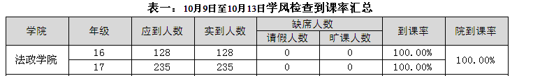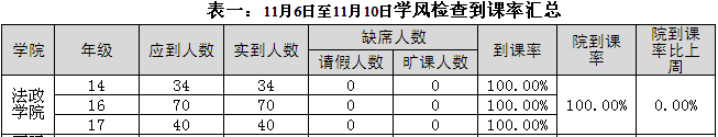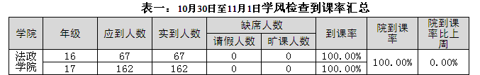 2017年11月6日至2017年11月10日,学生处组织人员对校本部110个班级的学生上课情况进行抽查。从抽查情况来看,学生上课秩序良好,上课教师普遍提前到达教室。法政香蕉视频 具体情况反映如下: